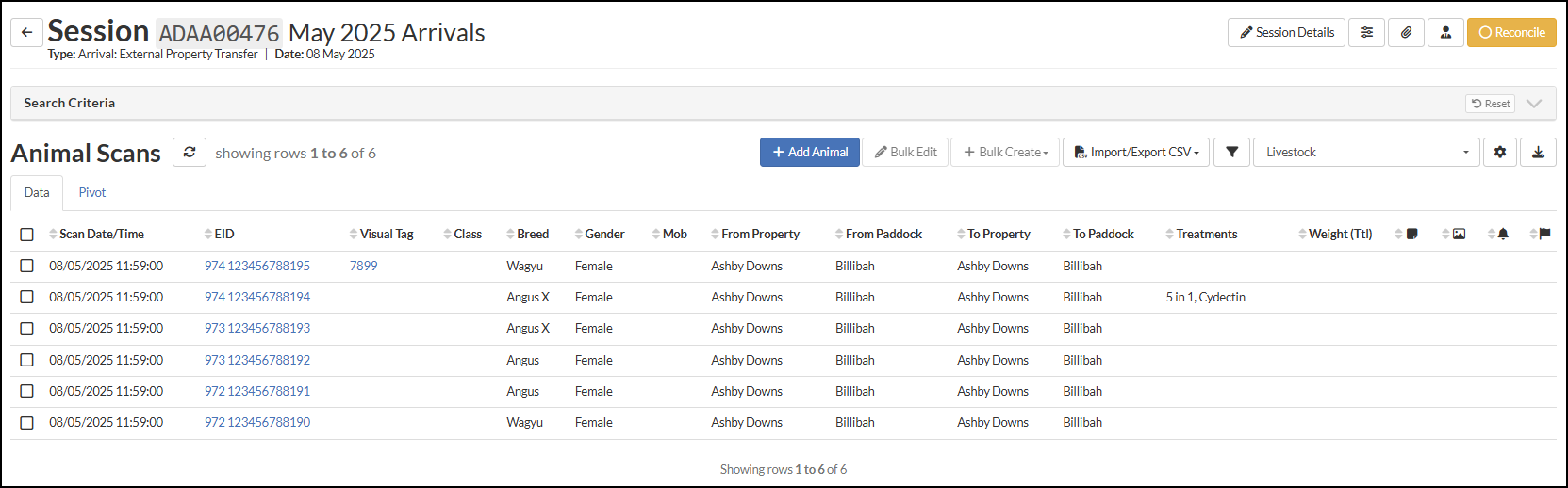 Only some animals have In or Out Session codes because only those animals were involved in the transfer.