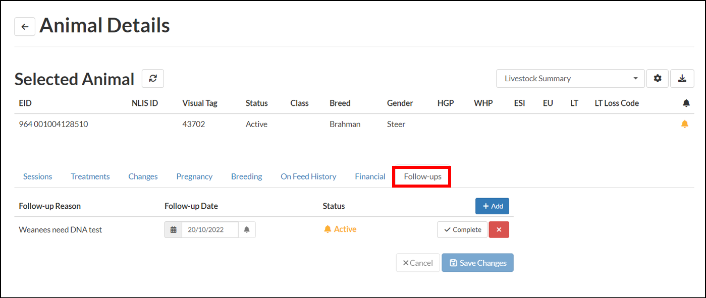 A Follow-up reason can be added directly on the Animal Details screen in the Follow-ups tab.