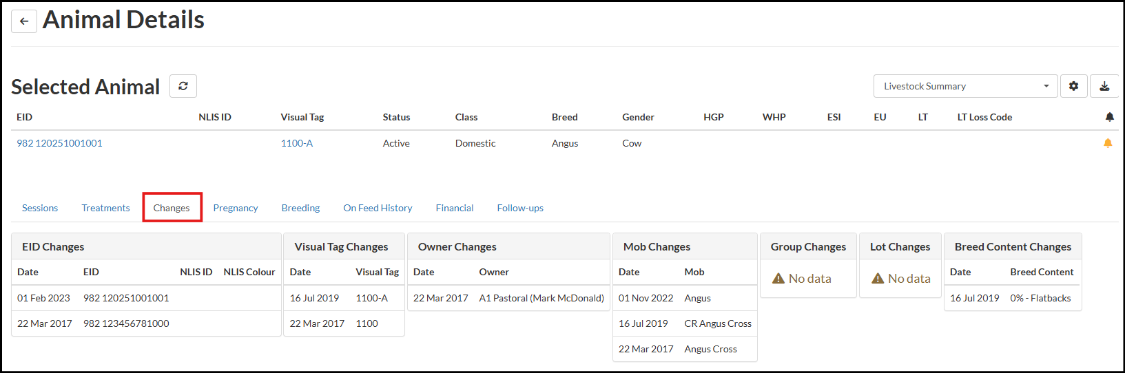 The Changes tab displays details of changes in EID, Visual Tag, Owner, Mob, Group, Lot and/or Breed Content.
