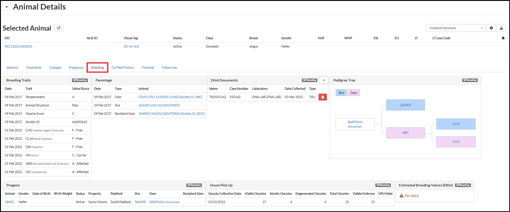 The Breeding tab displays the details of Breeding Traits, Parentage, DNA Documents. Pedigree Tree and Progeny. Refer to Pedigree Tree and Progeny List (web & app) for instructions on adding Parentage information to an animal record. Refer to Ovum Pickup (web & app) for details on recording Oocyte collection data to the animal record.