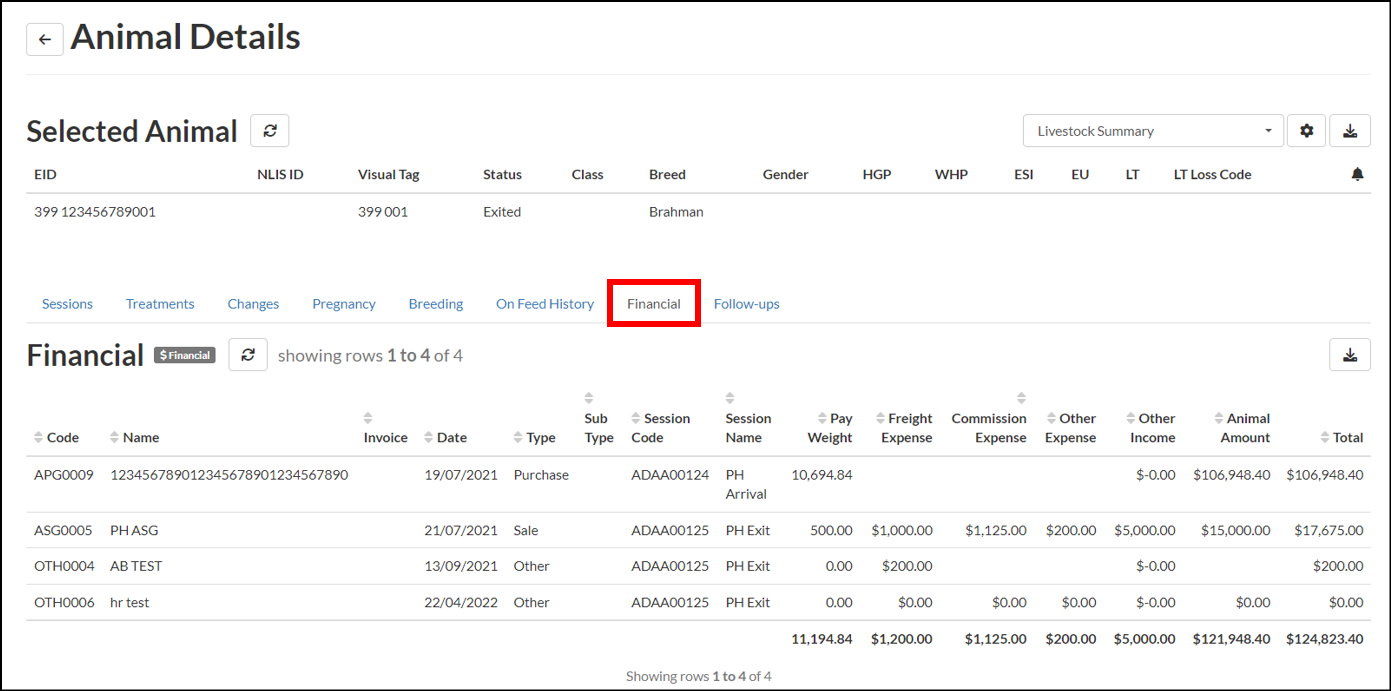 The Financial tab displays financial information for the selected animal. Refer to Add Financials - APG, ASG, OTH (web) for instructions on adding financial information to animals.