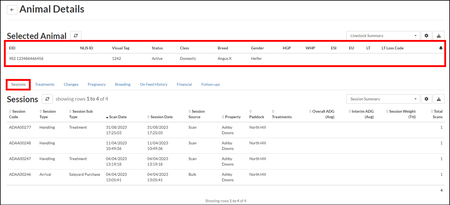 The Animal Details Screen displays the details for the Selected Animal. The Sessions tab displays the details of the Sessions that the animal has been a part of.