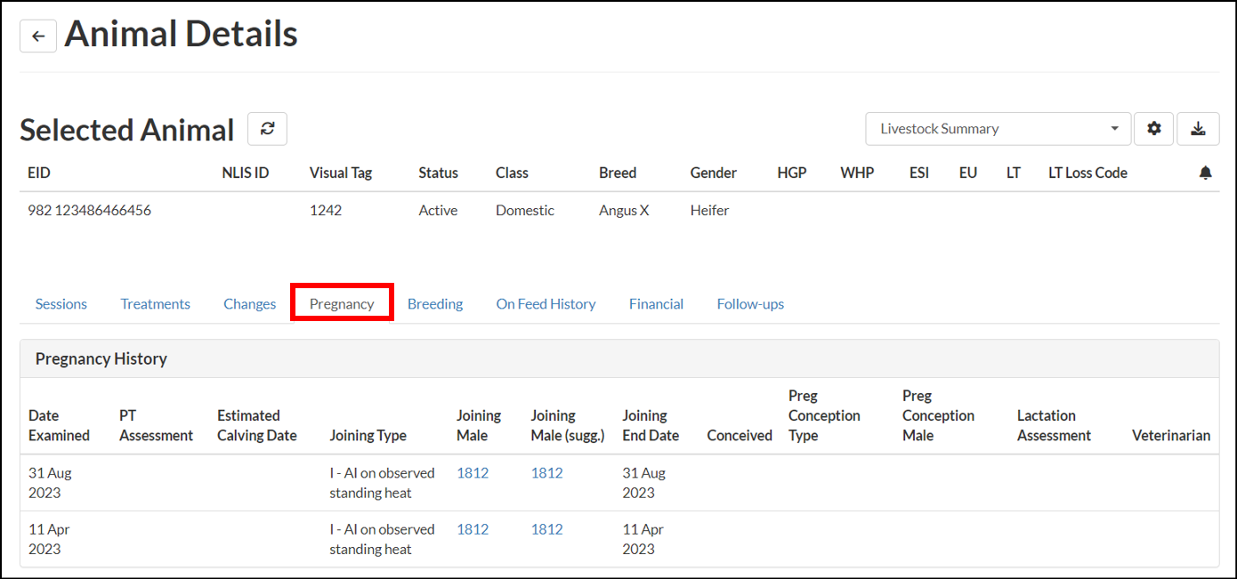 The Pregnancy tab lists details of pregnancy such as Joining, Conception, Estimated Calving Date etc. associated with the Selected Animal.
