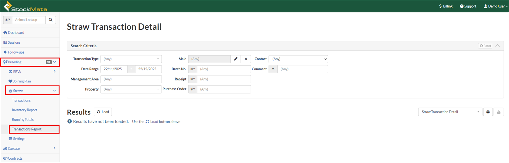 - Select Breeding, Straws, Transactions Report.