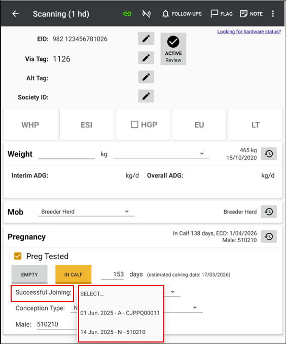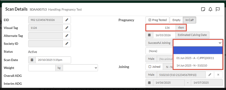 Results for the Successful Joining will be calculated using the settings and previously recorded joinings within StockMate. If only one result matches the calculation, the Successful Joining field will be automatically populated. If multiple joinings match the successful conception window, the options will be presented to select from.
