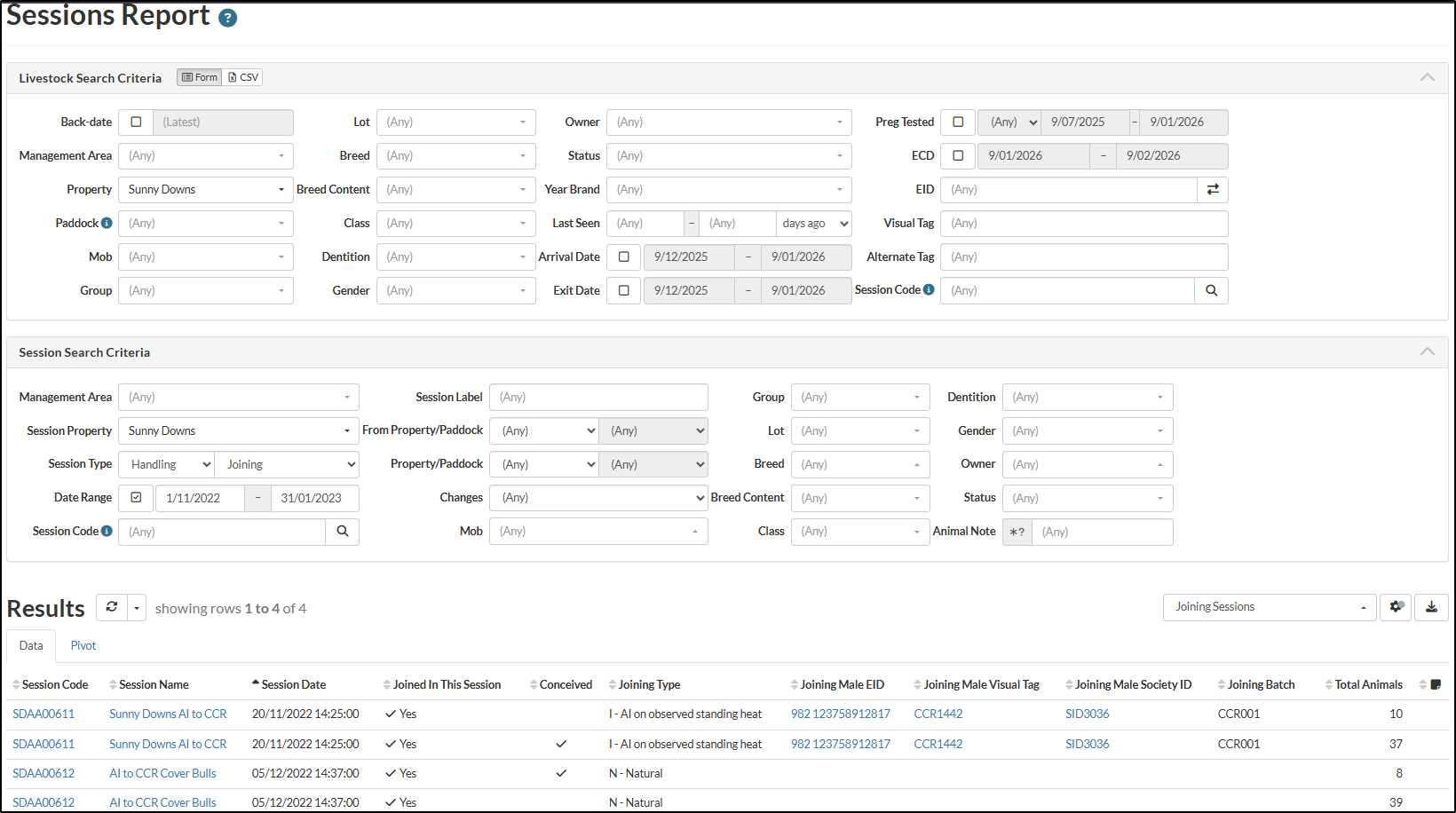 - The search criteria has been used to report on the season's joining sessions on animals in a given mob.
