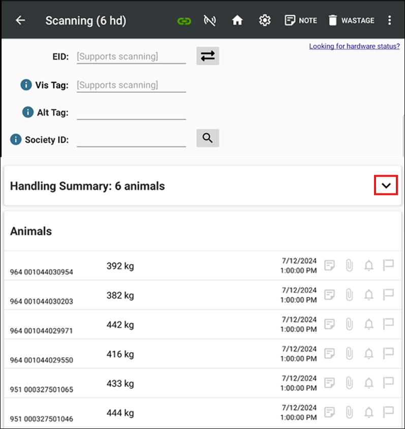 After saving each animal, the 'Summary' bar becomes visible. Tap it to view Total Weight, Average Weight, ADG and head summaries per Gate.
