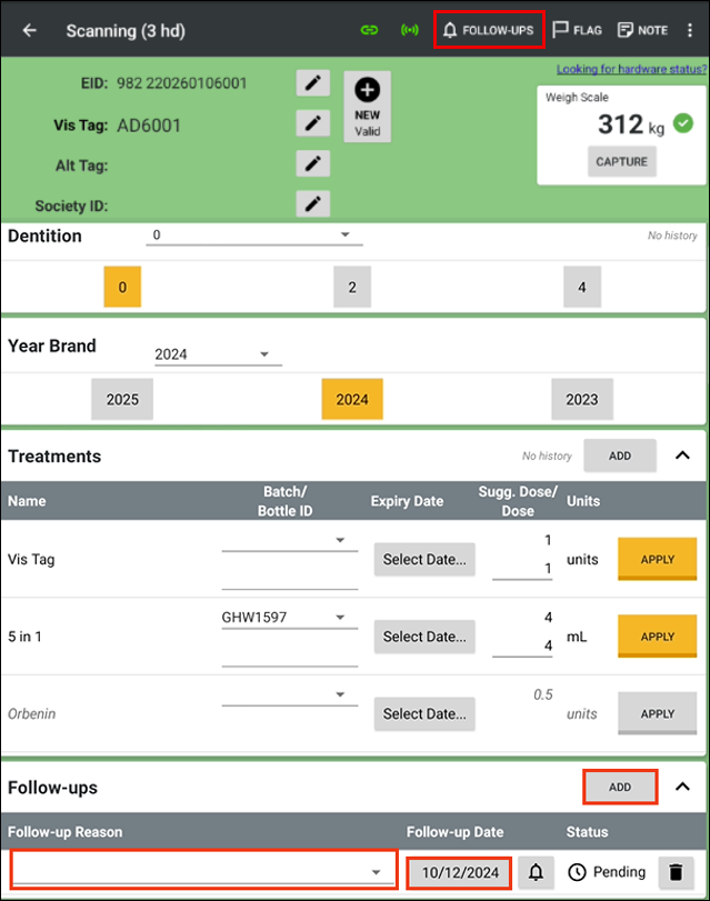 Follow-ups to add a Follow-up to the animal. Select