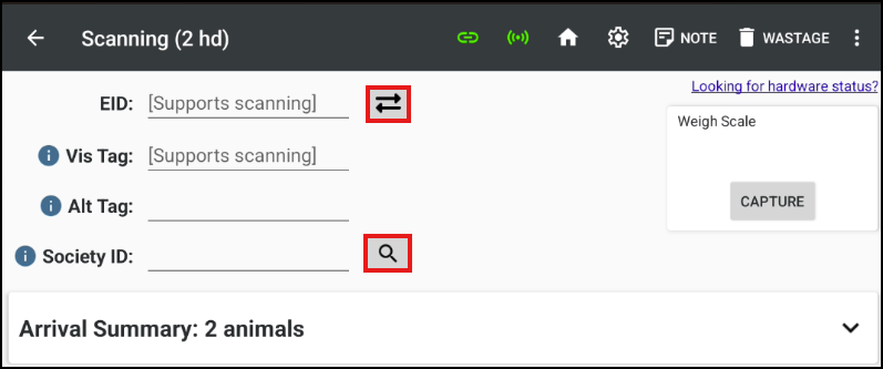 OR for animals that exist in StockMate, enter the Visual Tag, Alternate Tag or Society ID, tap Search.