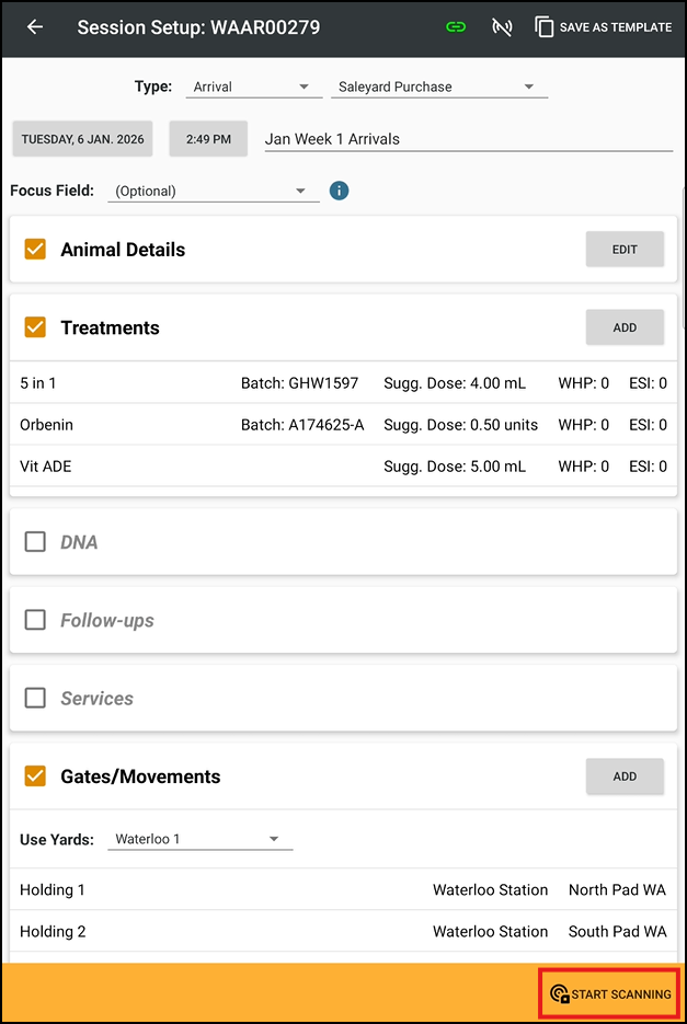Scan sessions are used when scanning individual animals for Arrival, Handling and Exit. Select Sessions, + New Scan Session. Input details of the Scan Session, ensure that Scan is selected, + Create Session. Select + Add Animal. Manually input the ...