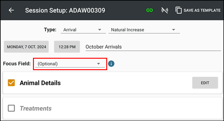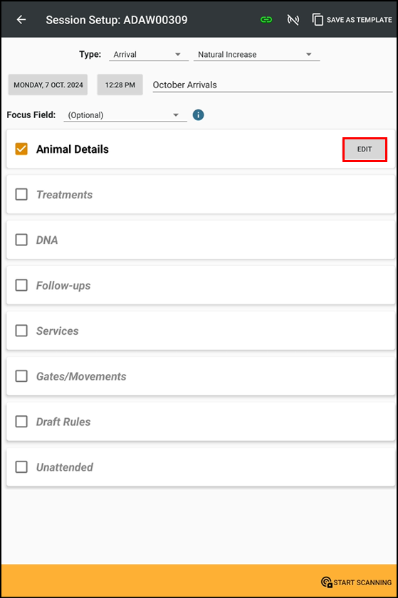 - The Animal Details section is usually included in a Session as it includes identifying information about the animals in the Session (otherwise, only EID and Visual Tag will be visible). Tick Animal Details, tap Edit.