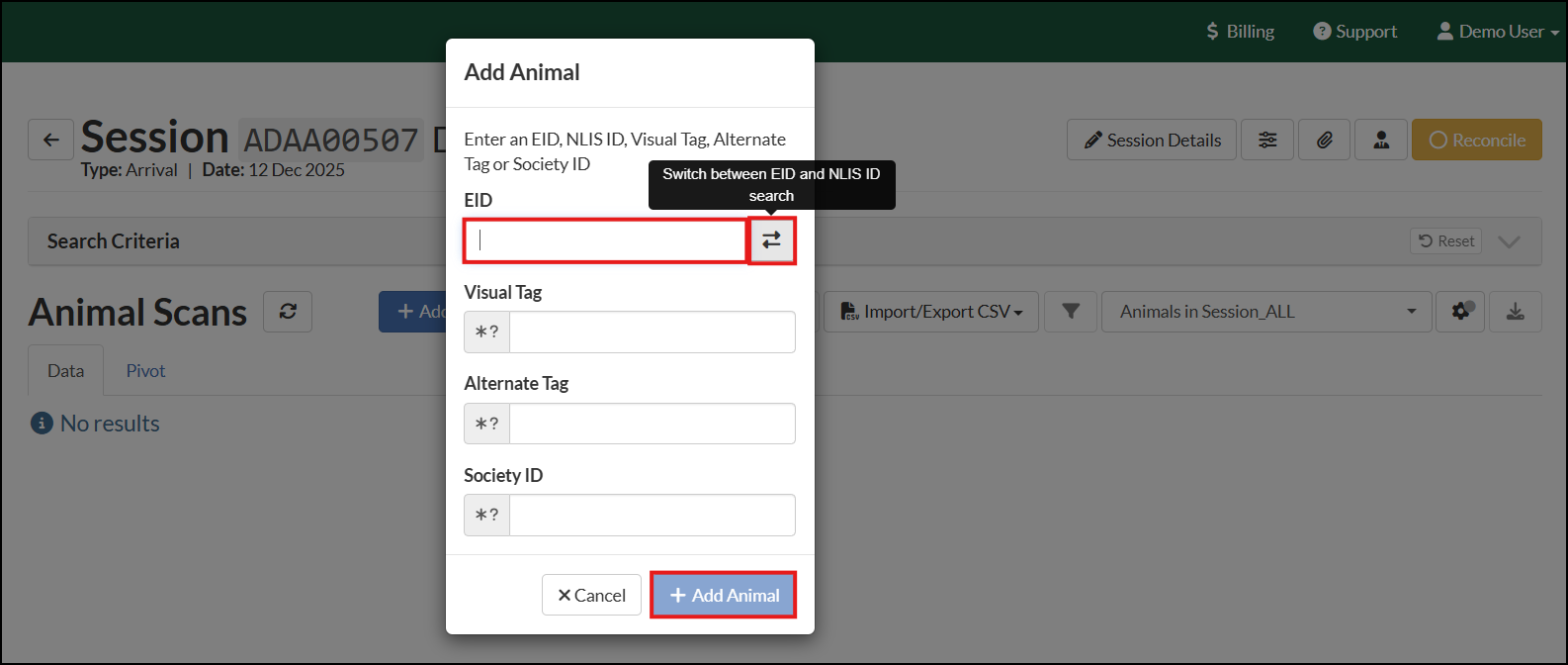Manually input the EID, NLIS ID, Visual Tag, Alternate Tag or Society ID details of each animal who is a part of the current Scan Session. Select + Add Animal.