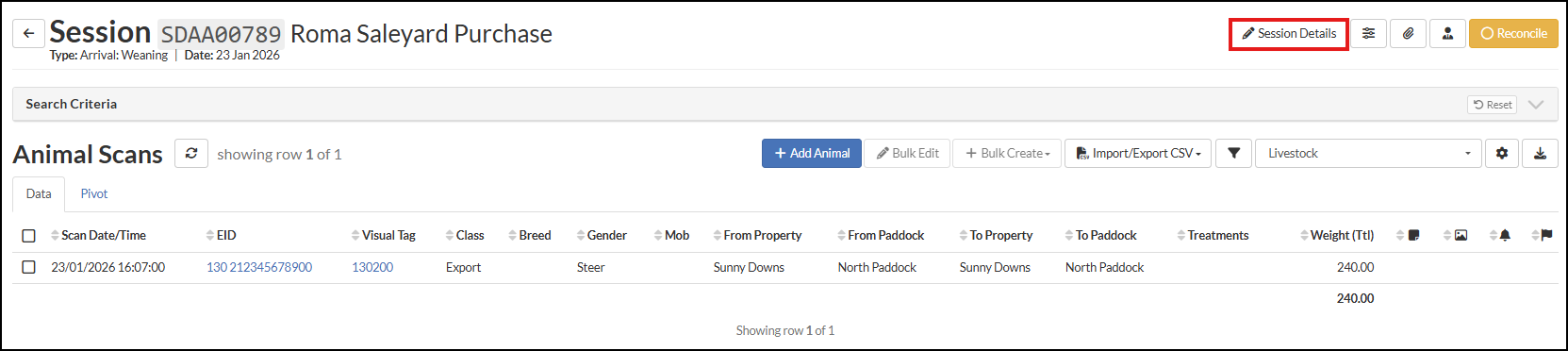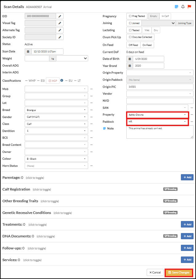 If new animals are being scanned, Property, Paddock and any Required fields must be entered prior to save.