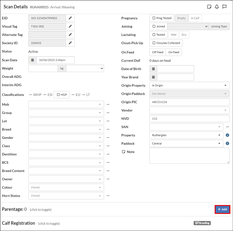 OR - In the Scan Details screen, input required information. Under Parentage, select Add.
