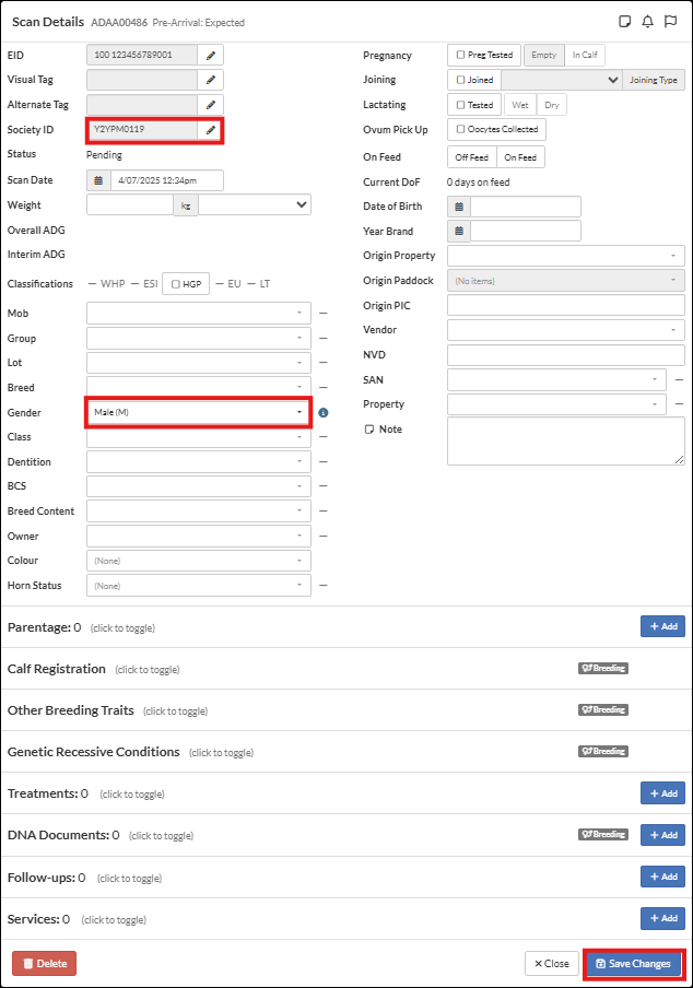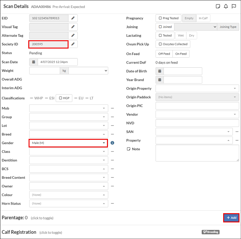 If the required animals already exist in StockMate (via Pre-arrival or other session type) they can be linked as parents to the appropriate animals via CSV import or Scan input.