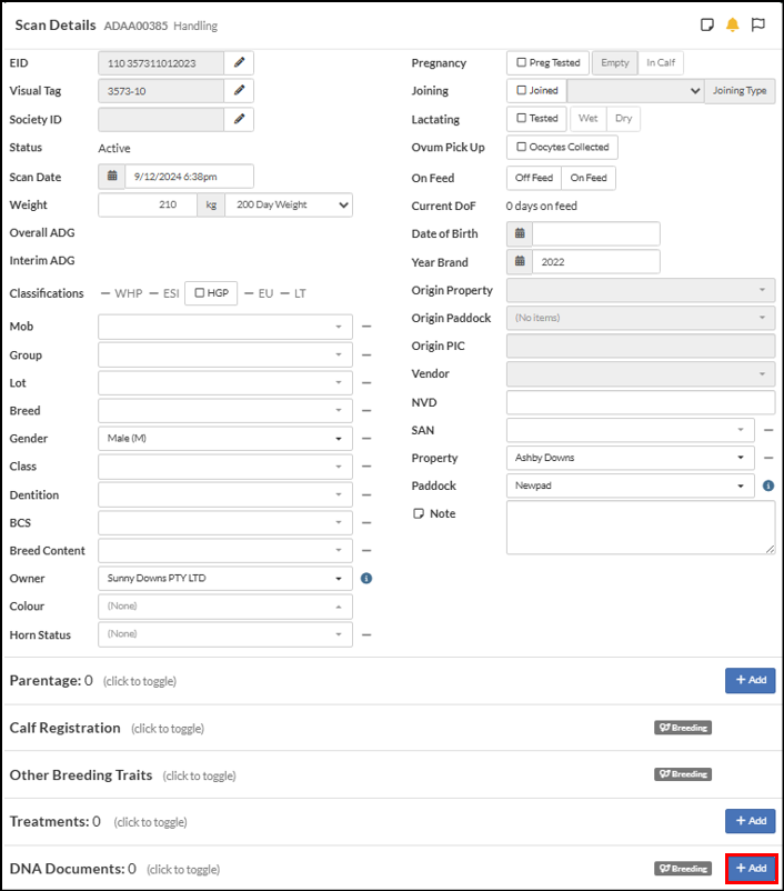 The StockMate App can be used when taking DNA samples to record the case number along with other details. When DNA documents are received they can be uploaded and saved against the animal on the web. The information can then be viewed in the scan screen, via the DNA Documents tab in Animal Lookup and other reports.