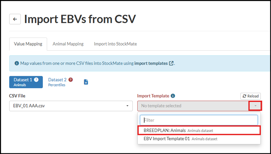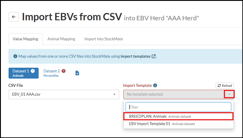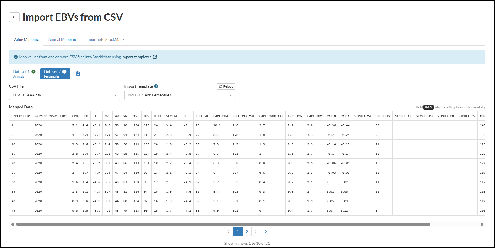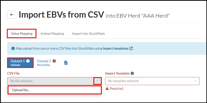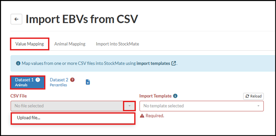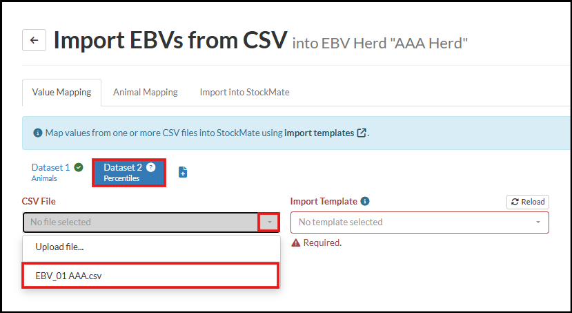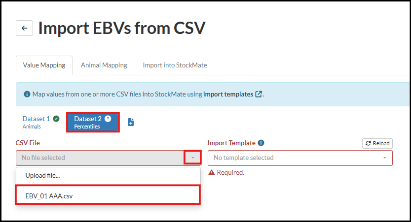 Importing EBVs requires, at the least, an Animals dataset Import Template AND Percentiles dataset Import Template. Refer to EBV Import Templates (web) for further assistance.
