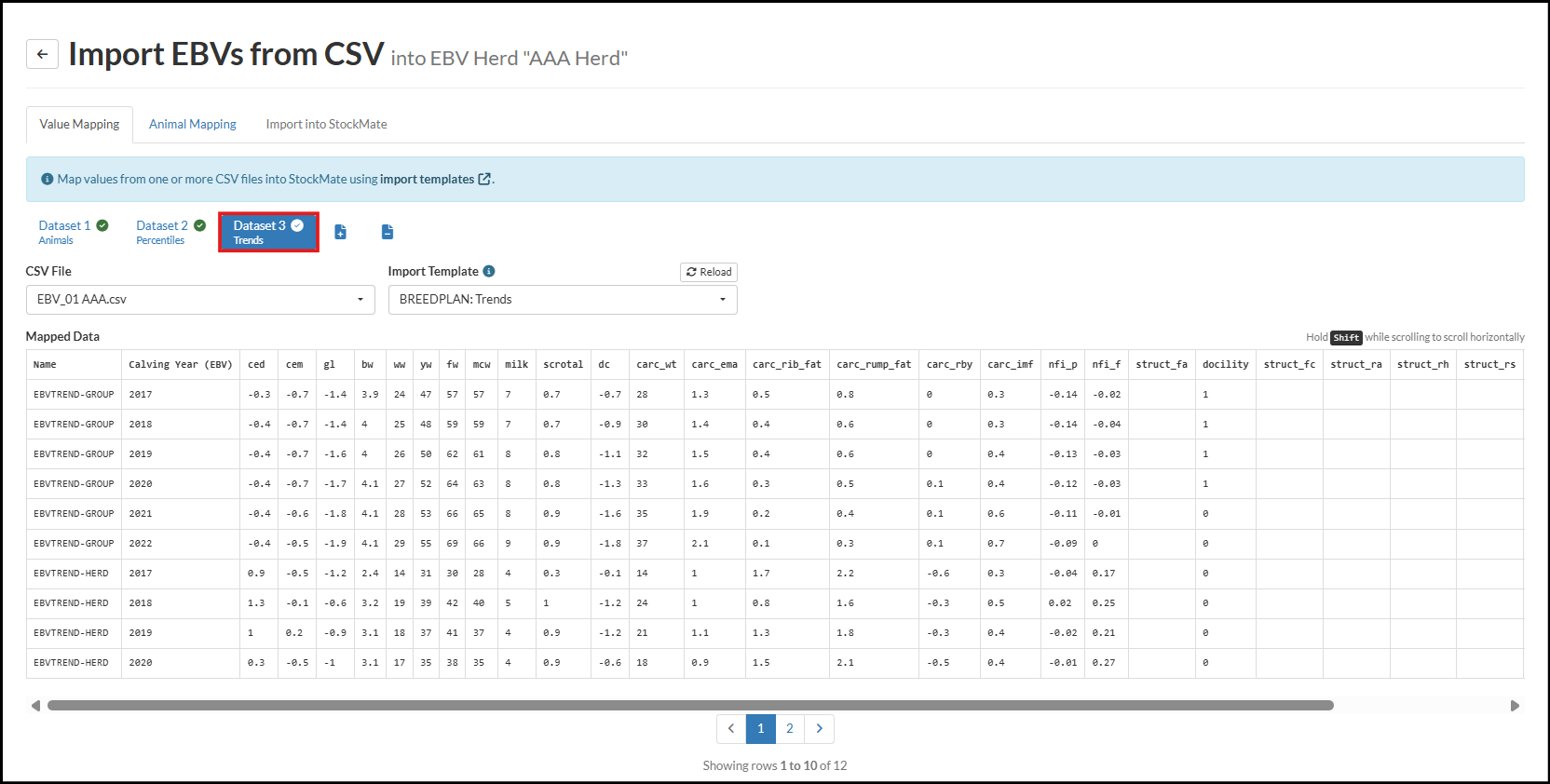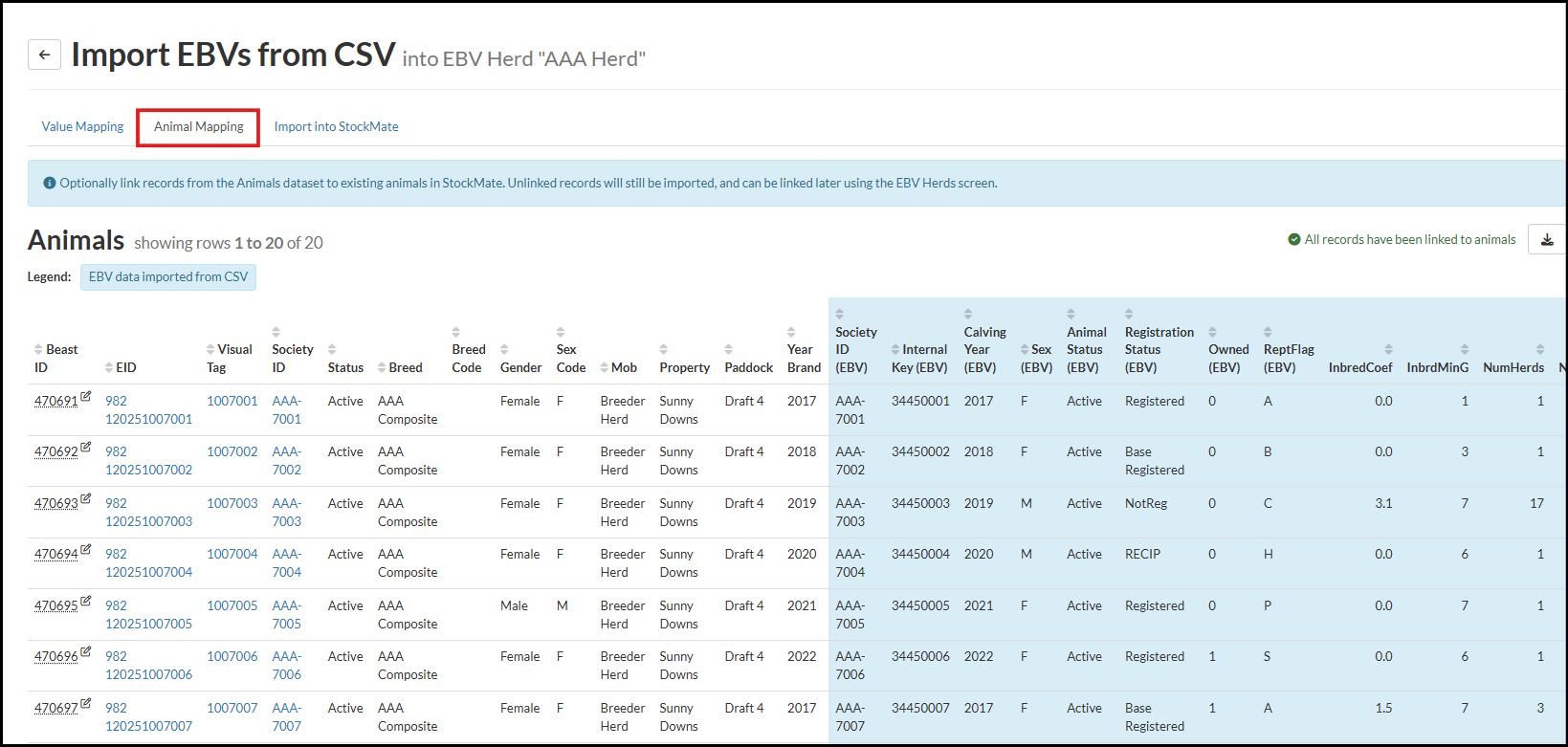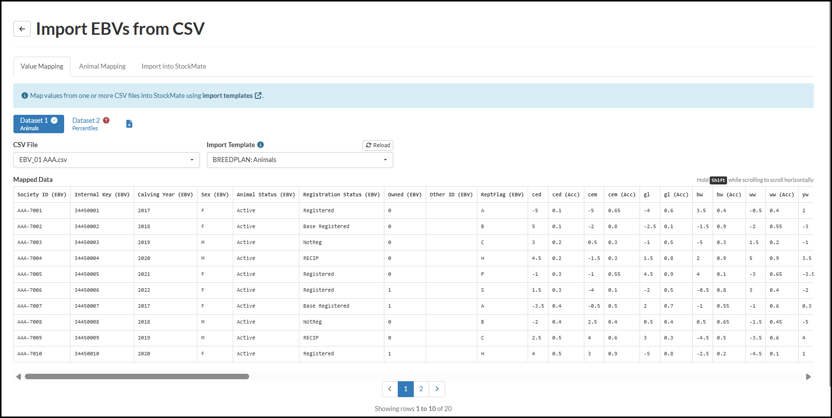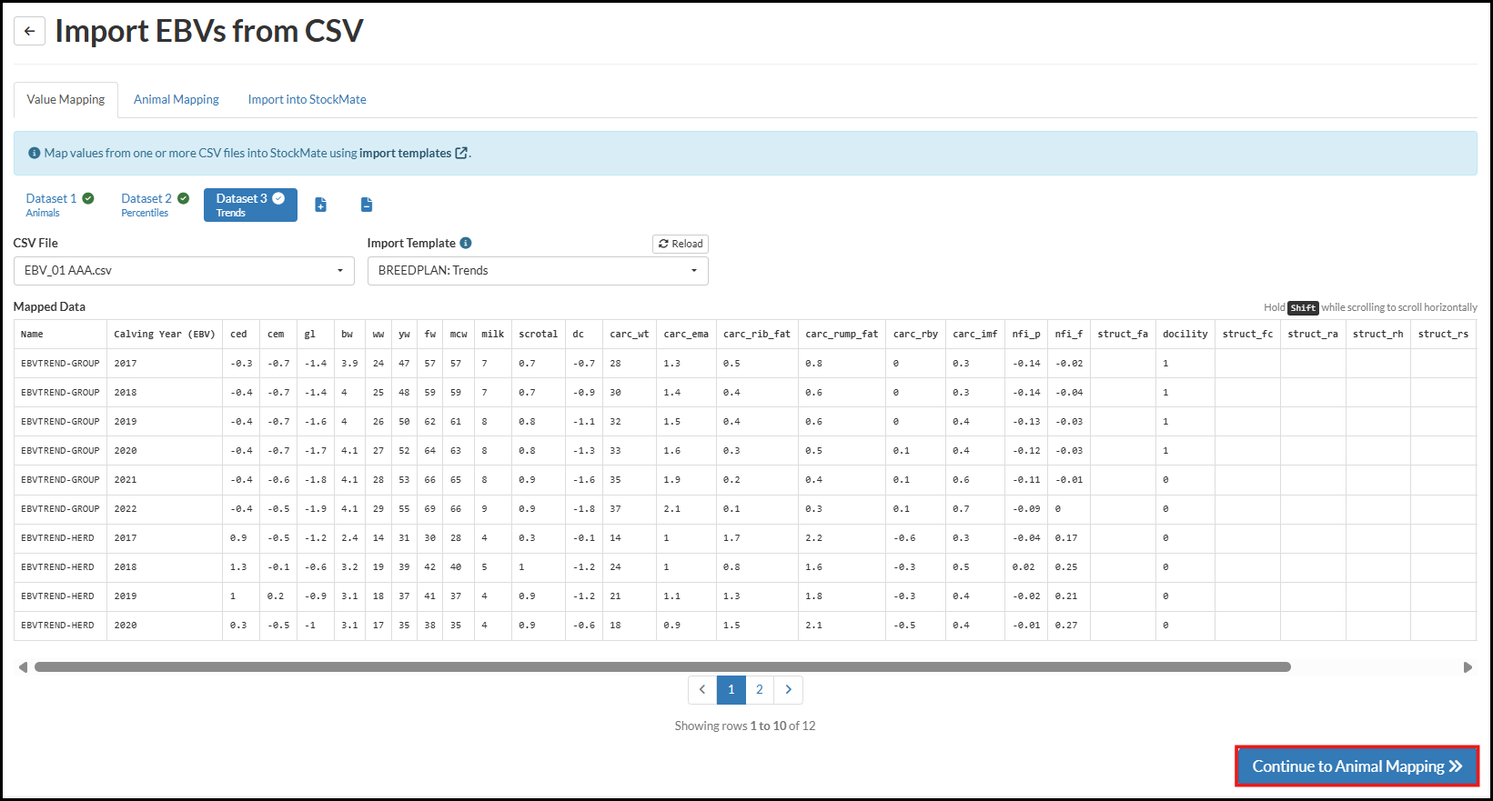 Work through each of the tabs to ensure all fields from the CSV file are mapped correctly and EBV data is linked to the relevant StockMate animals.