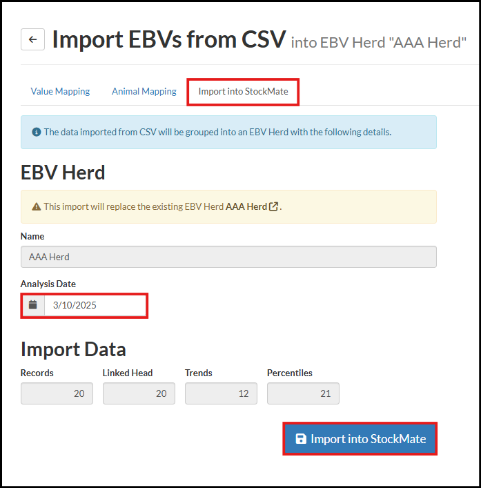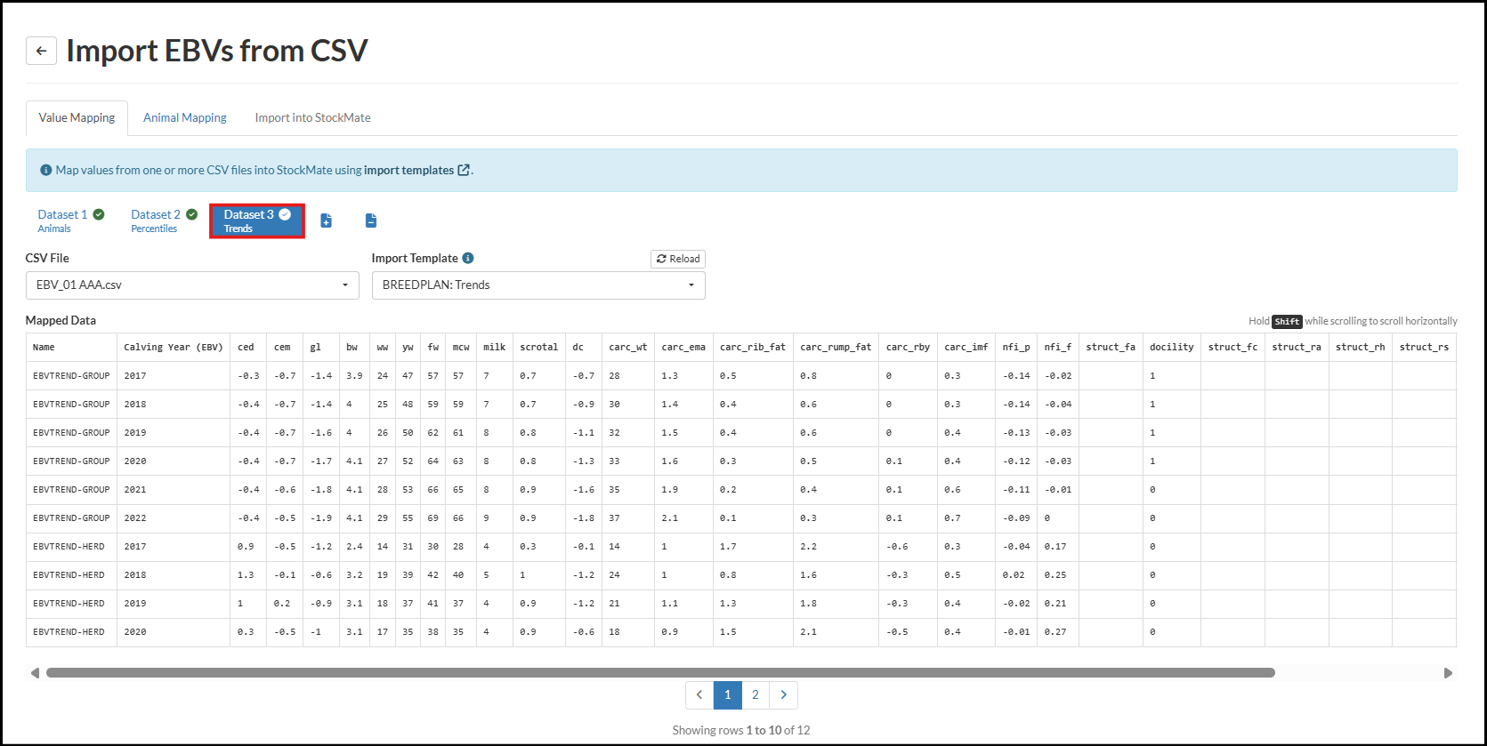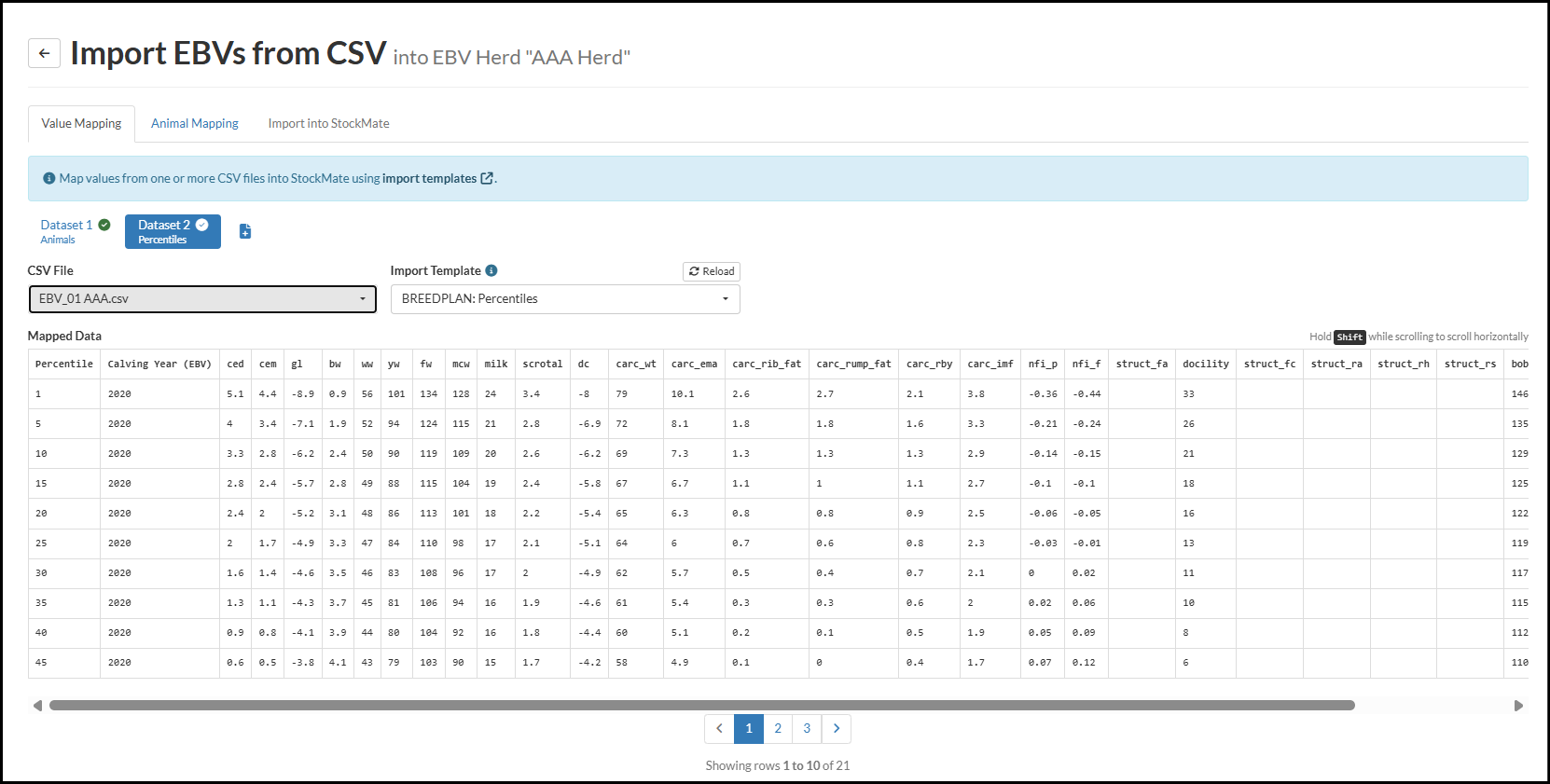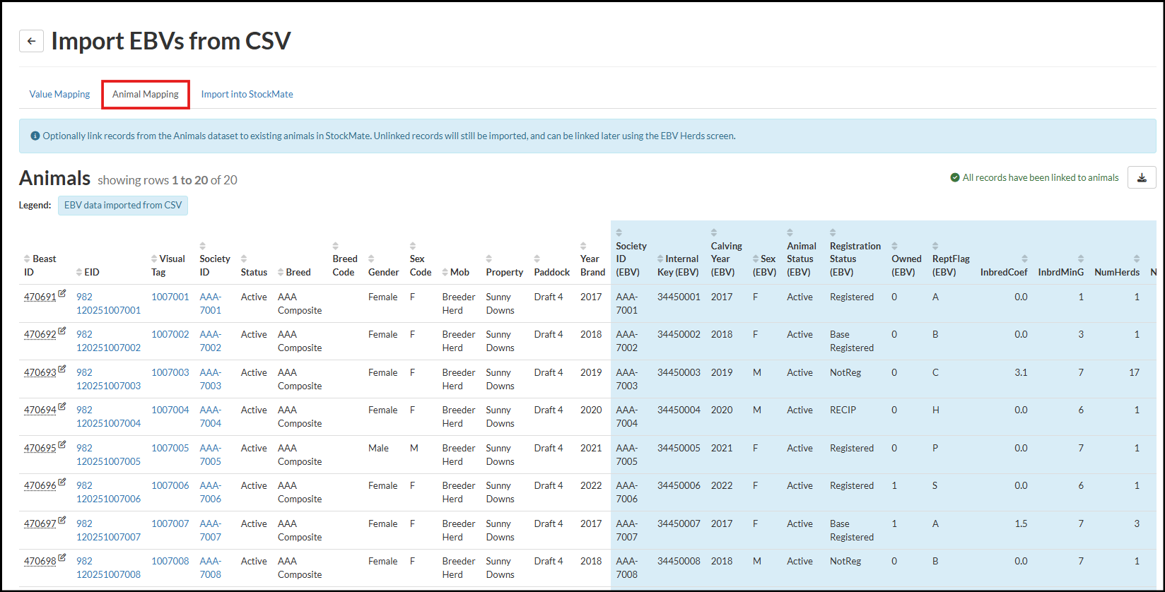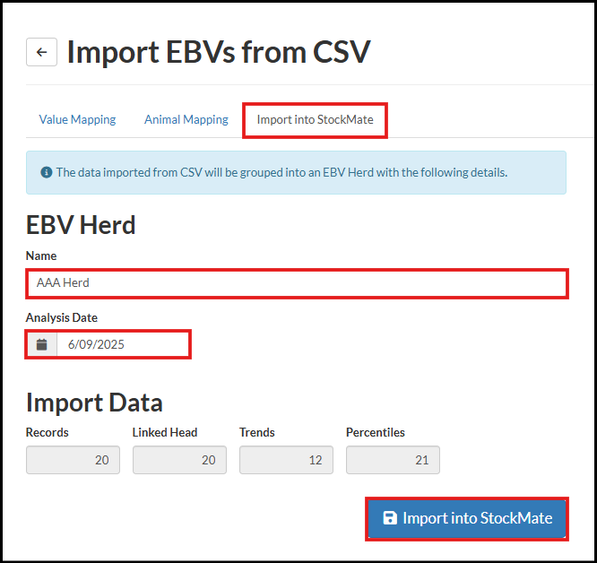 Work through each of the tabs to ensure all fields from the CSV file are mapped correctly and EBV data is linked to the relevant StockMate animals.
