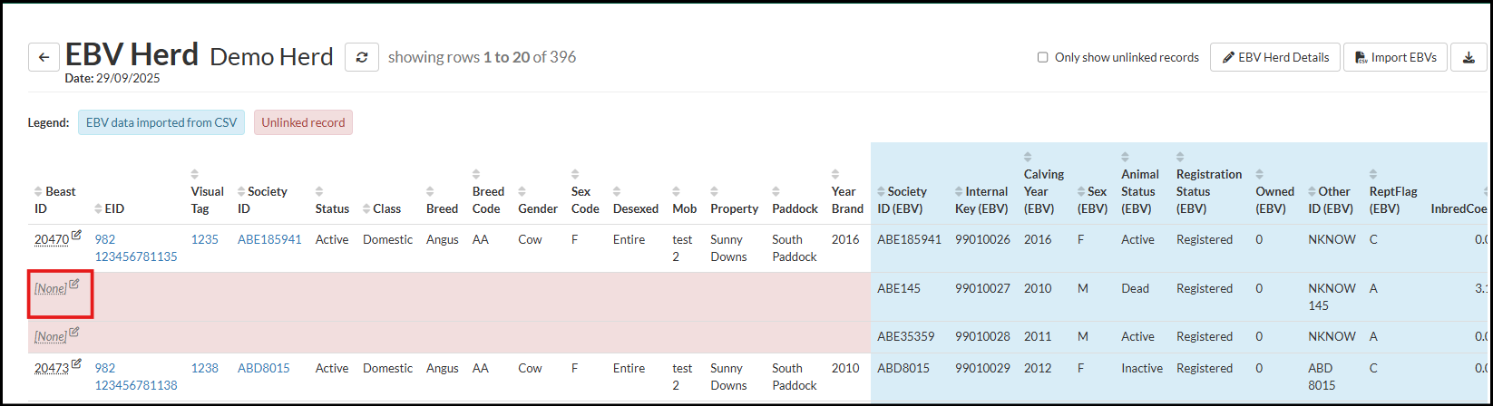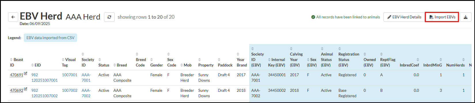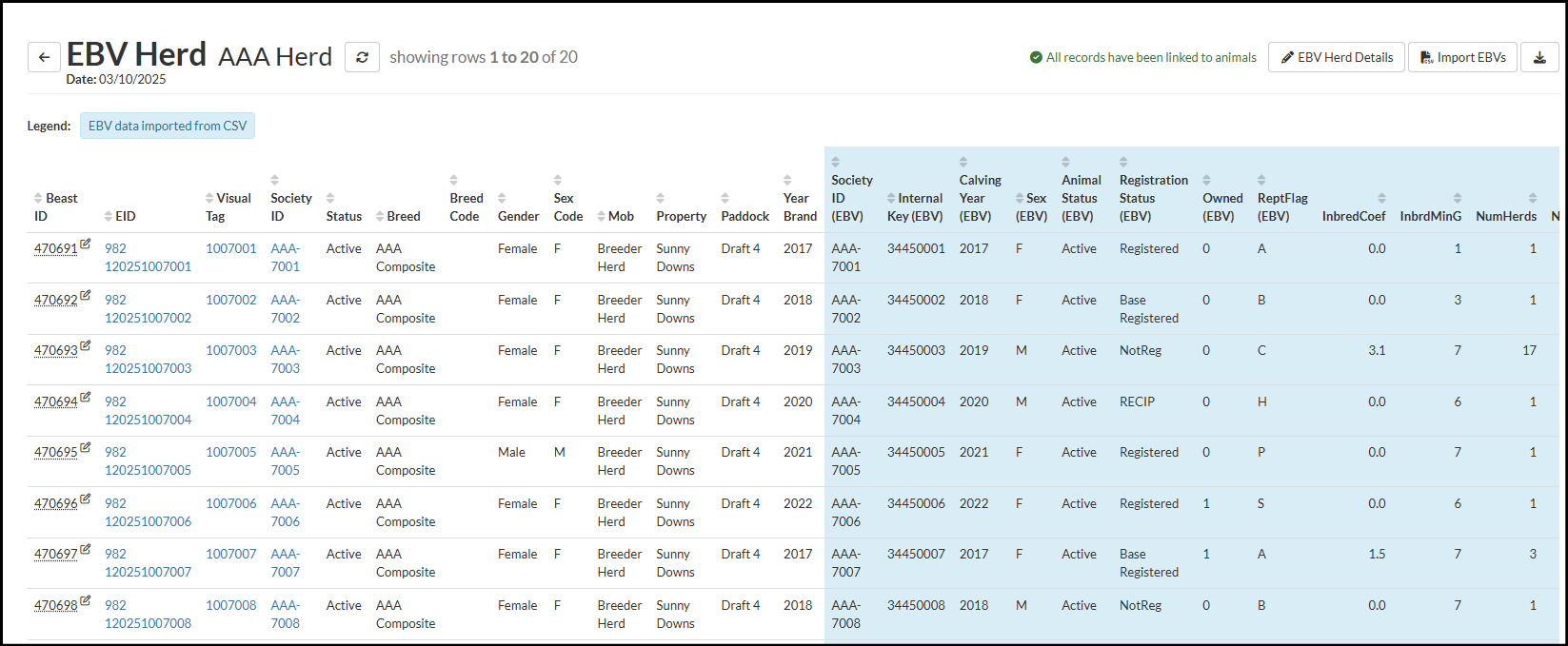 In Animal Mapping tab, review linked animals (table in white) with their corresponding EBV data (table in blue). Unlinked records can be Imported and can be linked later using the EBV Herds screen.