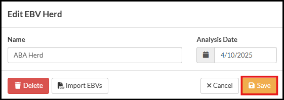 To Edit EBV Herd Details, like Name and Analysis Date, select EBV Herd Details from EBV Herd. Make the relevant changes and select Save.