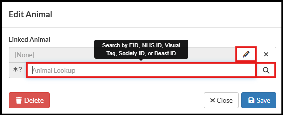 Select , input the animal EID, Visual Tag, NLIS ID, Society ID or Beast ID, select .