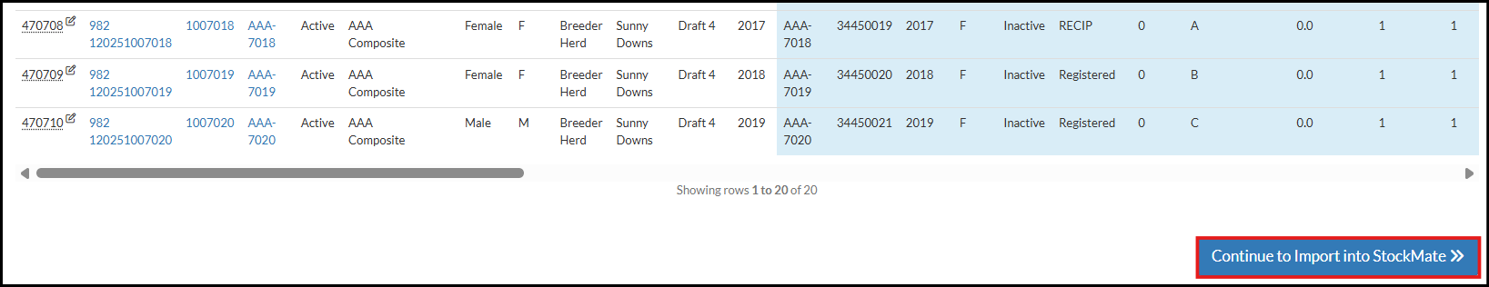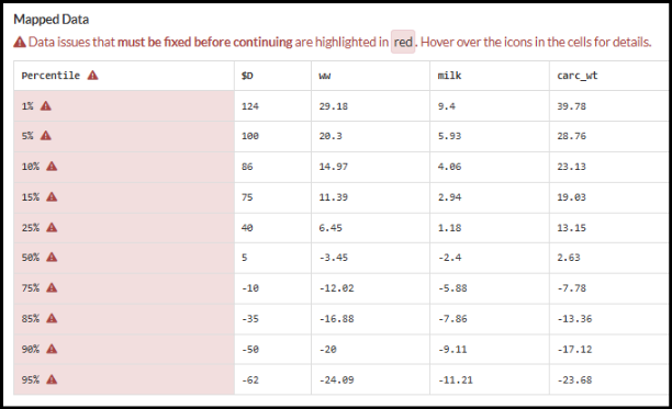 Mapped Animal data will be populated in a table. Any Data Issues will be highlighted to rectify before continuing to Animal Mapping.
