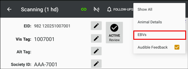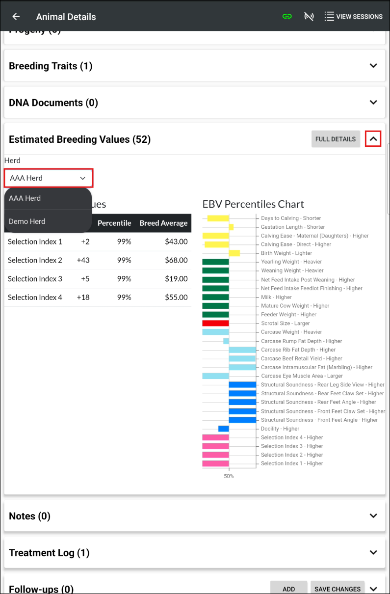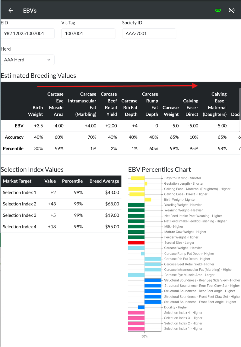 An animal's EBVs, Selection Index Values, and Percentiles Chart can be viewed from Animal Details on the App. Refer to