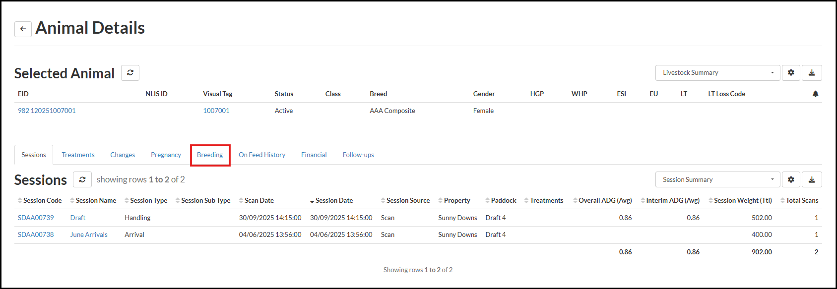 From the Animal Details screen, select the Breeding tab.