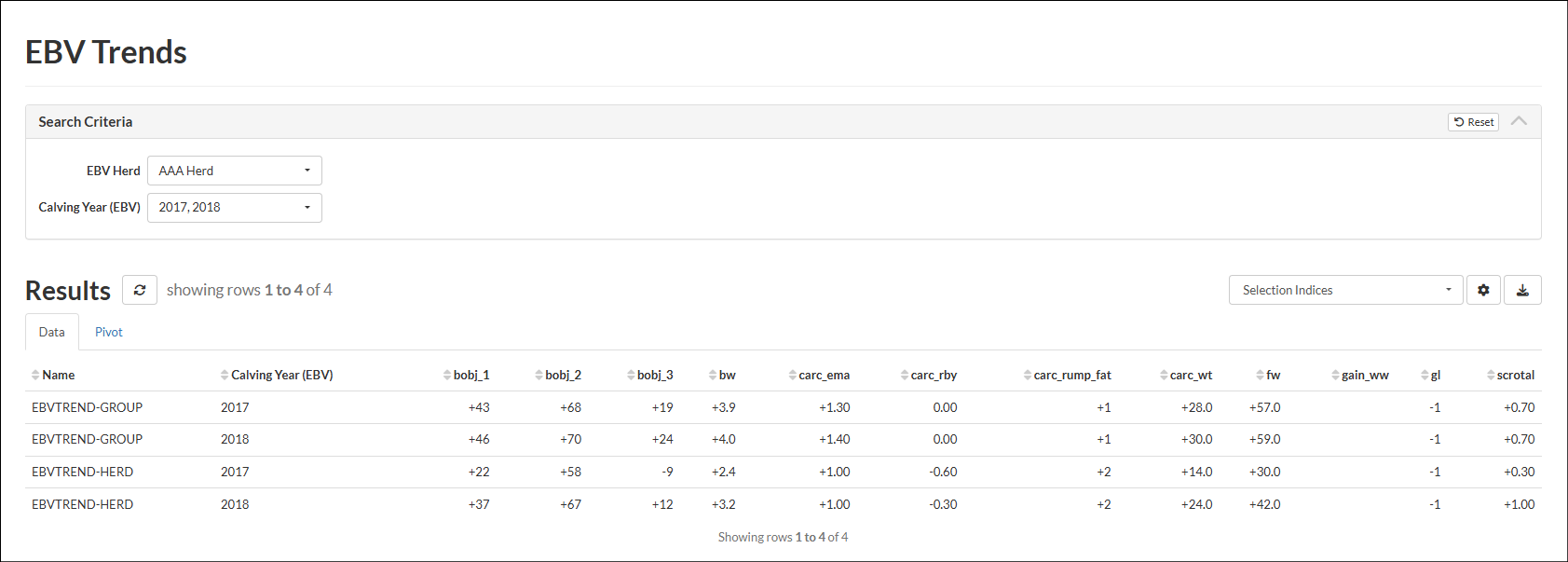 Group and Herd Trends based on animals EBV Calving Year, will be displayed in Results.