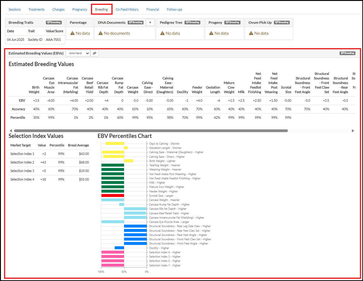 Selection Index Values and the EBV Percentiles Chart will be shown.