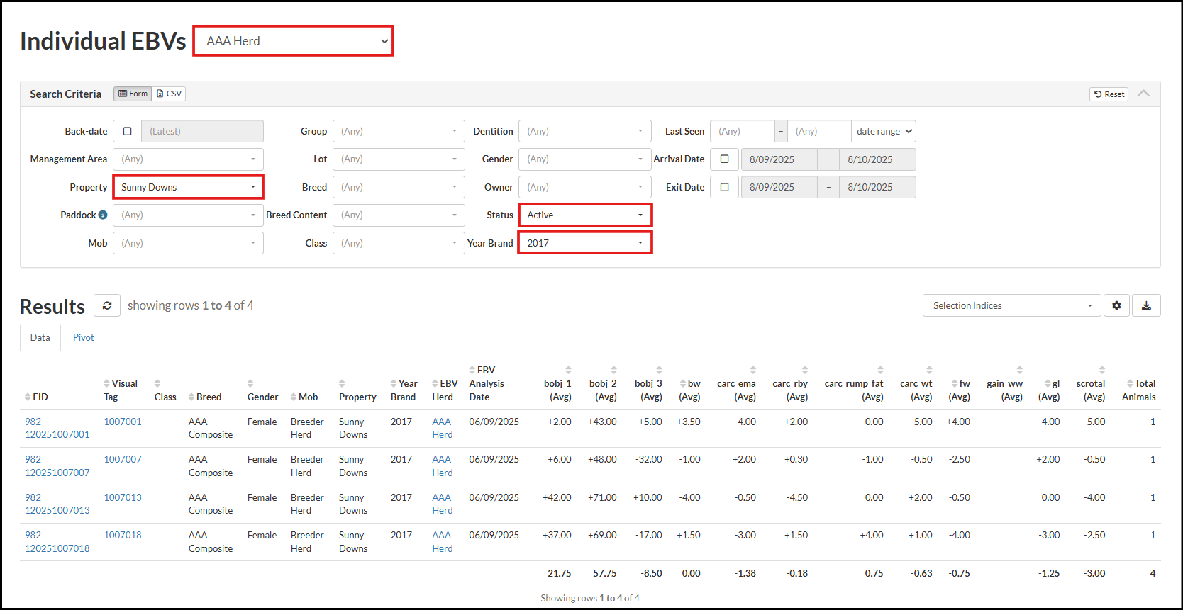Below shows Active animals from Sunny Downs, with a 2017 Year Brand in EBV Herd AAA Herd.