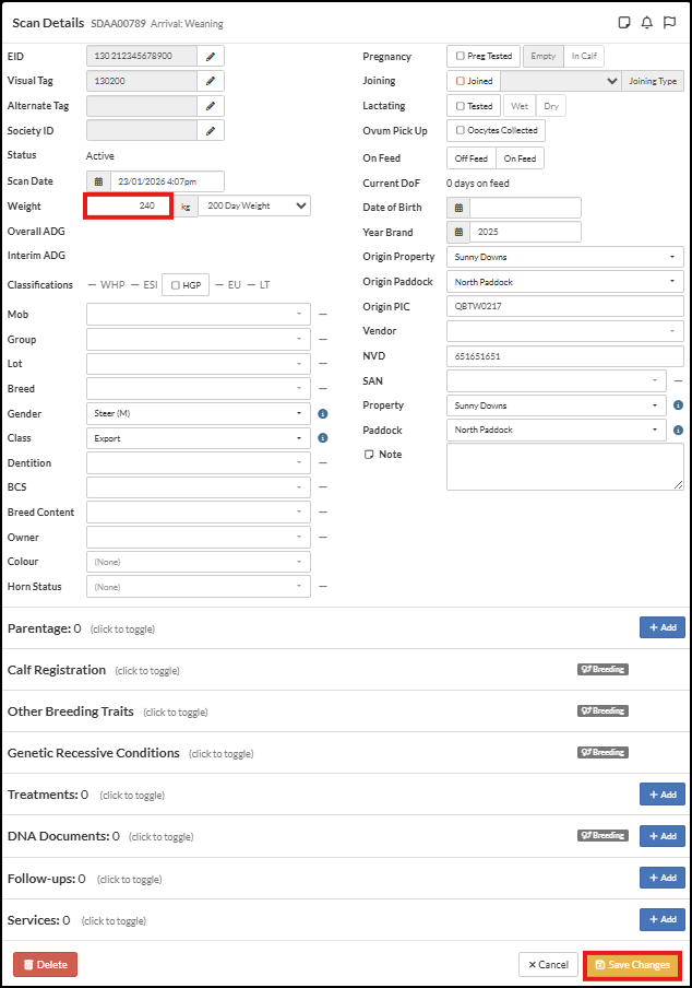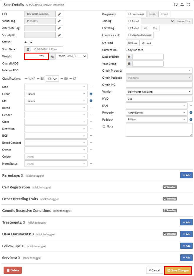 In the example, the weight of the animal was incorrectly recorded in the Arrival Session and is being changed via the web.