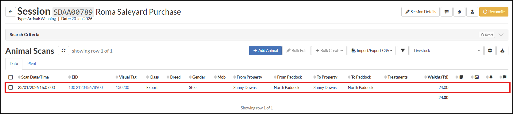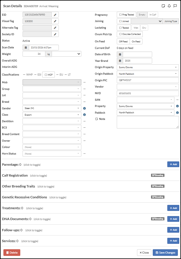 Existing Sessions can be edited or added to via the Scan Screen. This functionality is used to update an individual animal record.