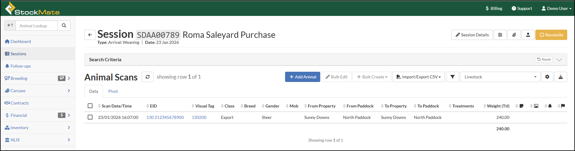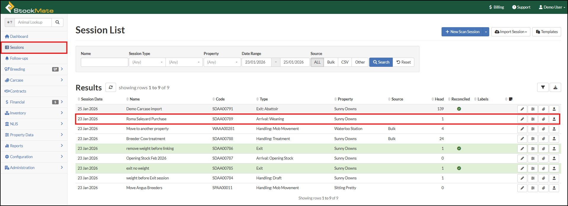 The Session Screen displays all the animals that were scanned, imported or bulk uploaded into StockMate in a selected Session. Other Session related information can been viewed, added or edited from this screen. Accessing the Session Screen Select ...