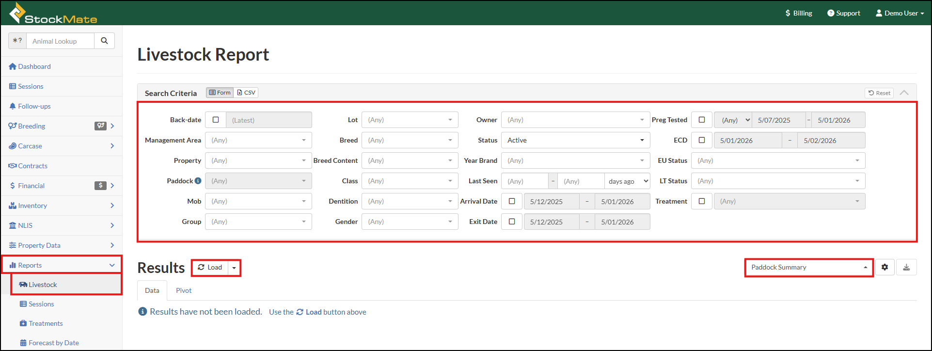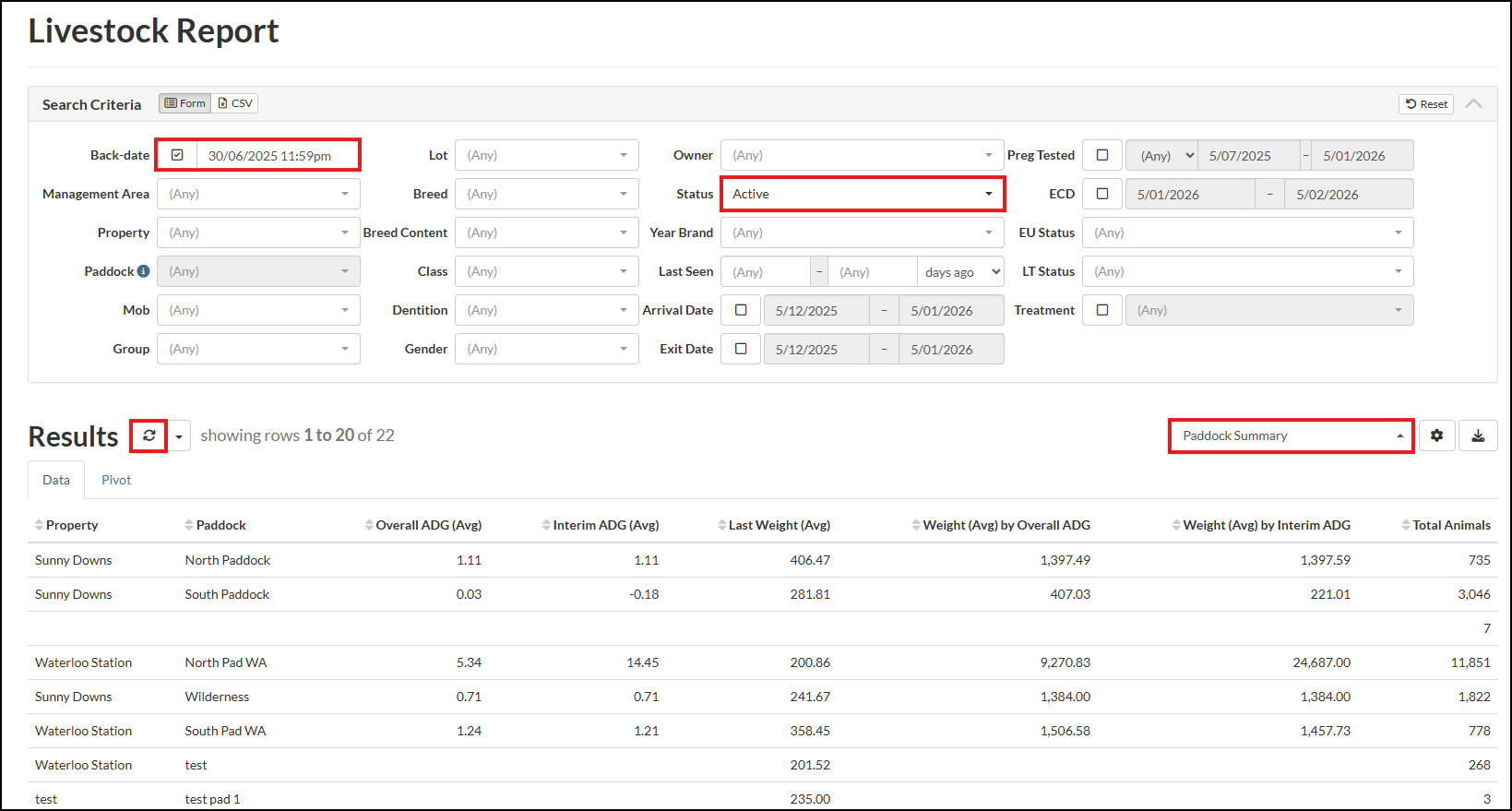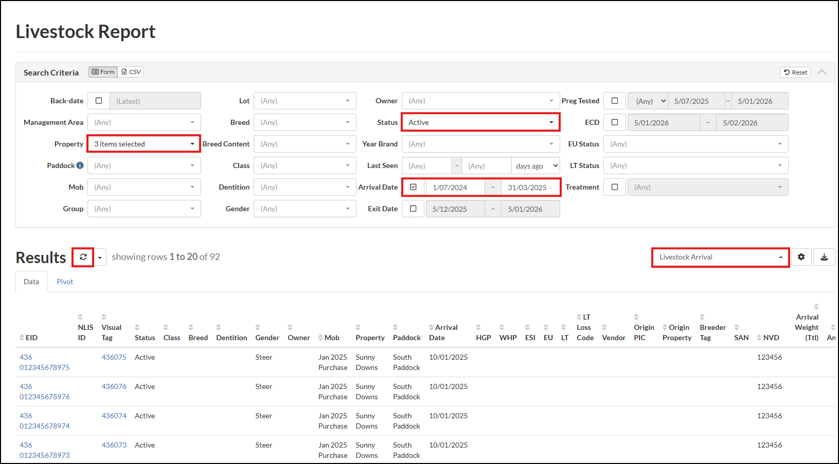 The Livestock Report displays Active animals, as at the report date, in StockMate. If required, the user can select to include Dead, Missing or Exited animals. The report can be highly customised to display a summary or detailed view as desired.