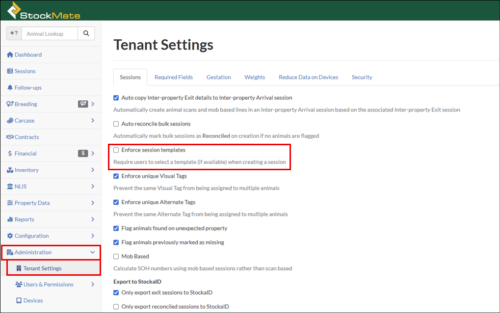 Only Administrators and Area Managers are able to set Mandatory fields in the Animal Details section of the Session Template setup.