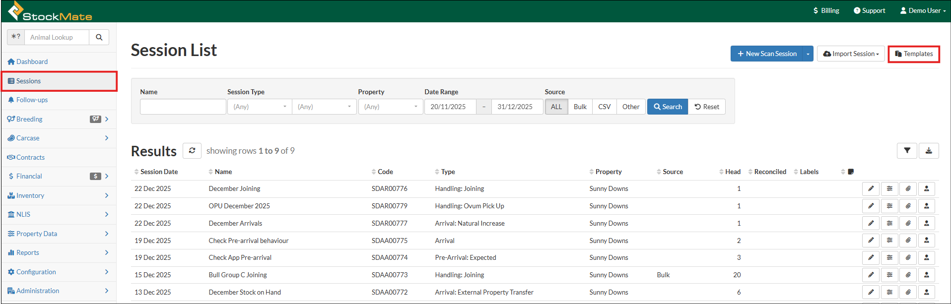 Sessions are heavily used throughout StockMate, for recording animal attributes, drafting, movements, examination results and applying treatments. They can be created via scanning animals, bulk selection or importing data using the relevant ...