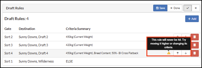 The order Draft Rules are setup in is important. Draft Rules are always assessed from the top of the list. If an animal does not match the top rule, the second rule is then assessed - and so on. A visual indicator of a Draft Rule that will not be assessed is displayed in the Session Setup.