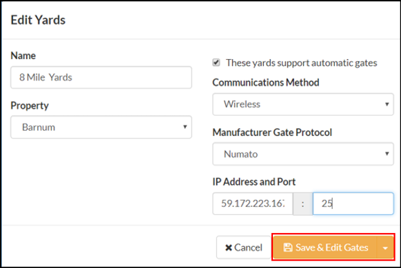 - If the yard supports automatic gates, select this option. This will enable you to add details regarding the Communication Methods, Manufacturer Gate Protocol, and the appropriate IP Address and Port numbers. Select Save & Edit Gates.